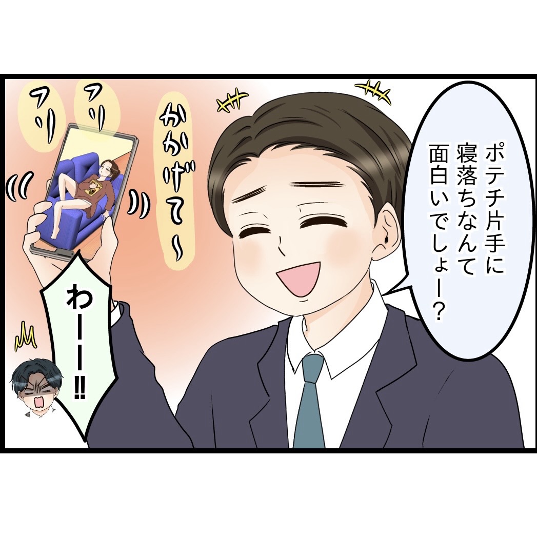 ポテチ片手に足を広げて寝ている奥さんの写真を「可愛いでしょ〜♡」とみんなに見せるまさるさん。