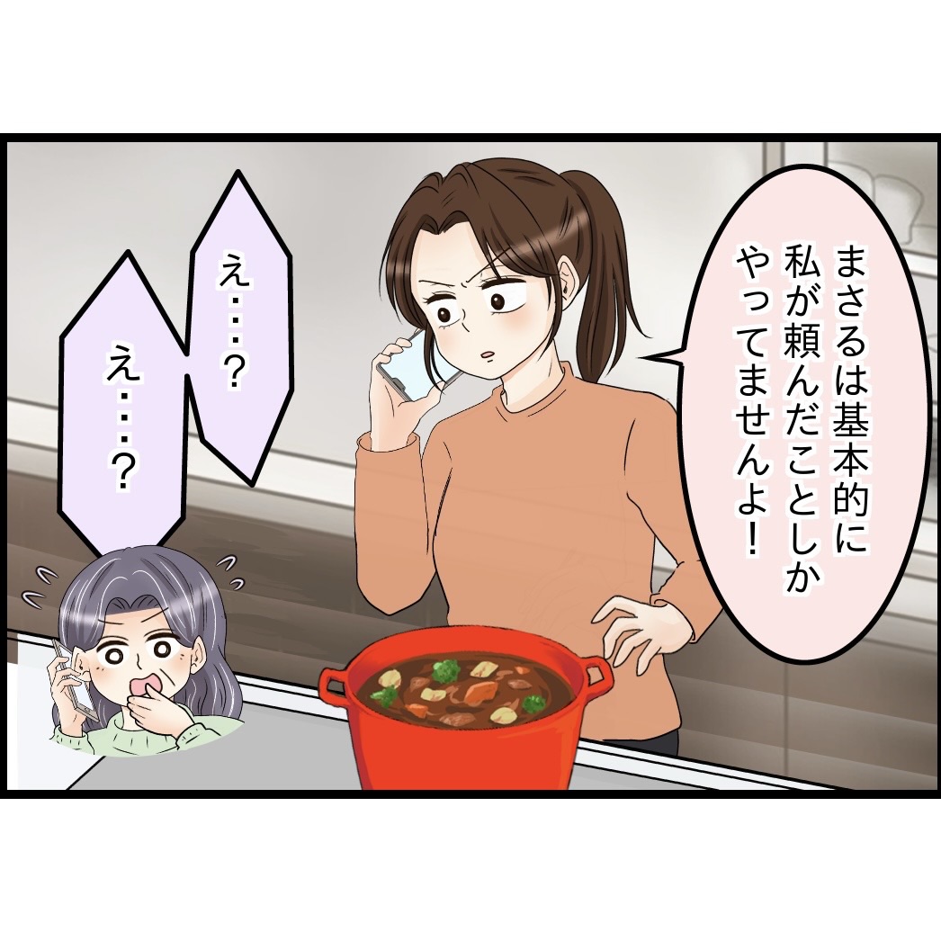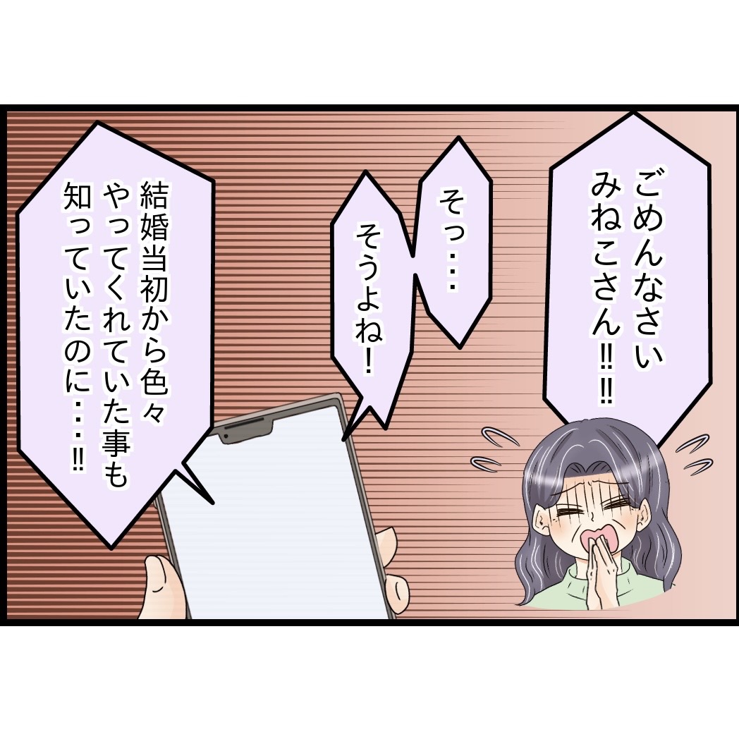 みねこさんが色々家事などをやってくれていた事は知っていたが、まさるさんが「何もしないみねこでもいいんだ」みたいな事をちょこちょこ言うようになって、「もしかしてみねこさん何も出来ないほどずっと体調がよくないのかも、、、」と心配になって電話をしてきてくれた義母さん。