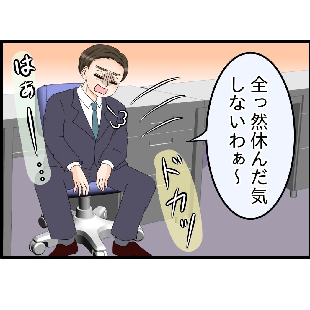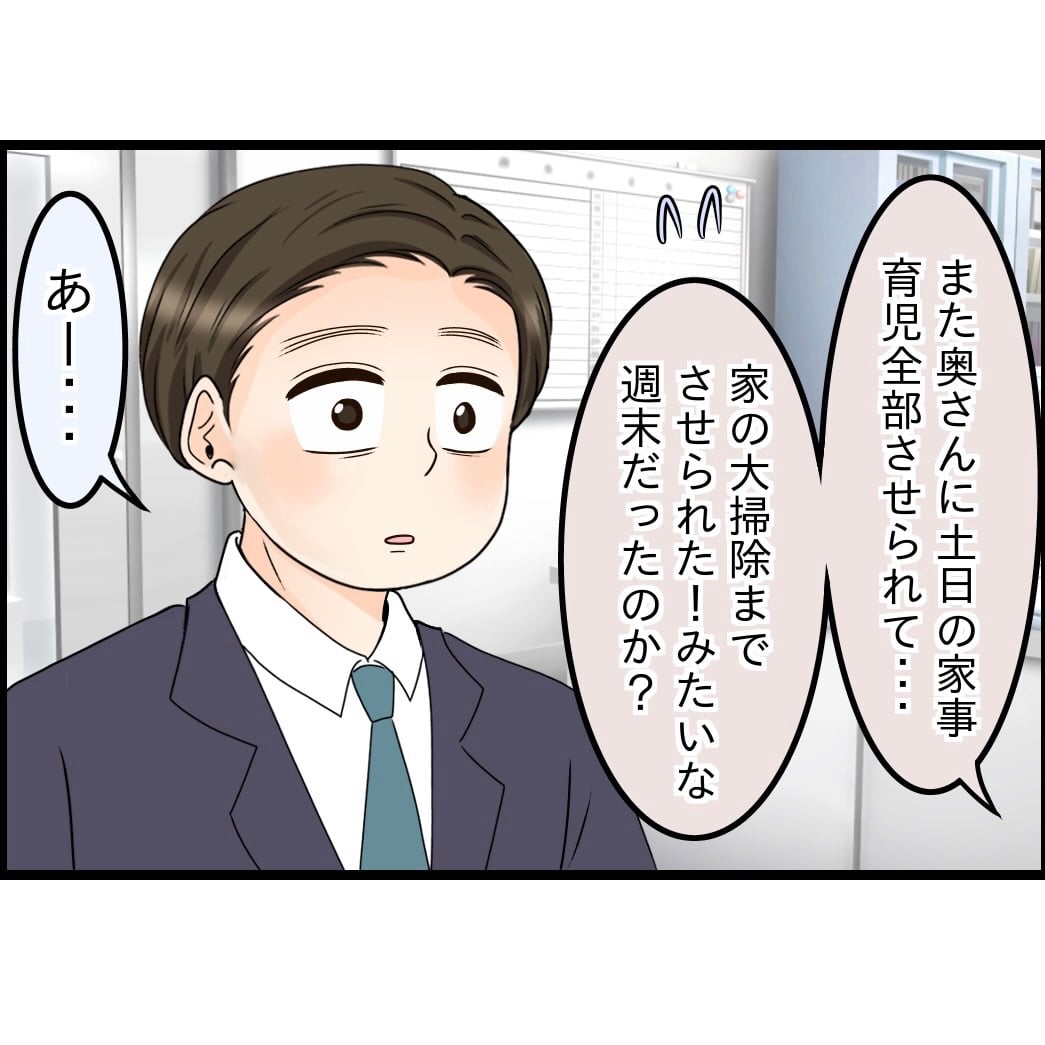 週末に一通りの家事をさせられて、翌週ぐったりしながら出社したまさるさん。